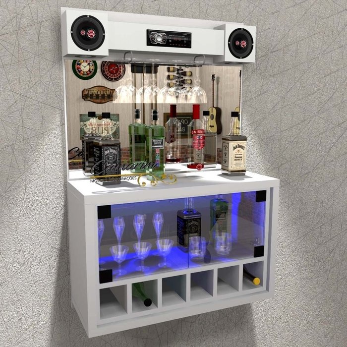 Barzinho de Parede " Top " com Caixa de Som 5" - 6 Adegas, Cristaleira, Iluminação Led Rgb - - Mdf B