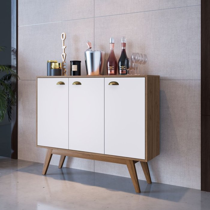 Este produto é aquele multiuso com design clássico para você utilizar onde quiser. Sua versatilidade permite combinação com ambientes residenciais e comerciais, podendo ser utilizado como aparador, buffet, barzinho, rack e o que mais sua criatividade sugerir. As três portas do BRM83 oferecem um excelente espaço interno para acomodar desde utensílios domésticos, até materiais de escritório. Todas as portas contam com puxador em formato de concha e dobradiças em aço. Os pés possuem formato inclinado e são fabricados em madeira maciça. A qualidade é um destaque desta peça. Fabricado em MDP com tratamento contra cupins e ecologicamente correto, possui acabamento Melamina. Produzido com material ecologicamente correto.