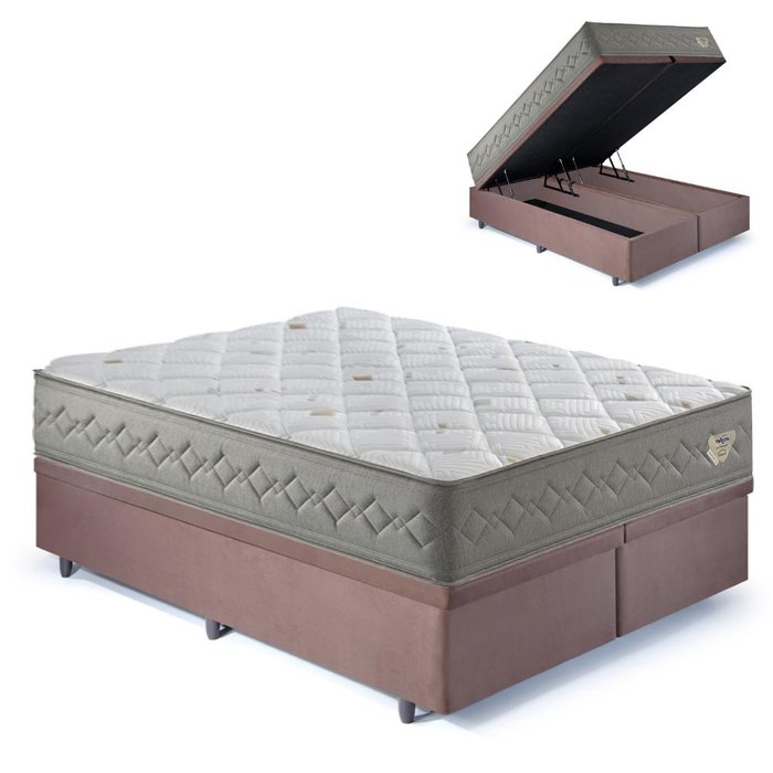 Conjunto Baú King + Colchão New 4 Estações Molas Ensacadas Ecoflex King 193x203Este modelo em um lado é CONFORTÁVEL e no outro é FIRME. A vantagem de você poder escolher no conforto do seu lar a melhor opção. Colchão desenvolvido na mola ensacada Wide, que se adapta a todos além do conforto sem flutuação. Os dois lados o acabamento do pillow é em tecido em malha, mais fresco, mais maleável, além de auxiliar na firmeza ou conforto de acordo com as espumas e tipo do bordado, pois são diferentes em cada lado.Por que escolher a cama Baú King?Conheça os diferenciais
