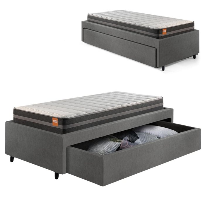 Na parte superior, o box é projetado para acomodar um colchão de solteiro padrão 88x188 cm, mas sua estrutura externa possui dimensões maiores, 99x199x38 cm, garantindo um encaixe perfeito e maior estabilidade. Além disso, a gaveta inferior é ampla e ideal para armazenar diversos itens, como brinquedos, roupas de cama, livros e muito mais.