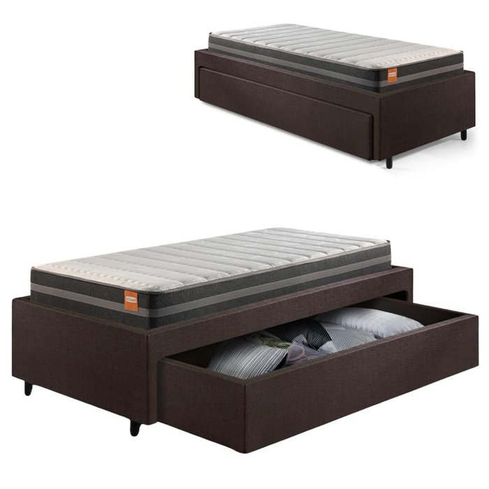 Base Box Cama Solteiro Sapateira Courino Linho Marrom e Colchão Bogota Inducol 88x188 Marrom