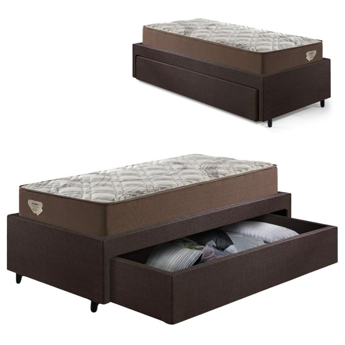Na parte superior, o box é projetado para acomodar um colchão de solteiro padrão 88x188 cm, mas sua estrutura externa possui dimensões maiores, 99x199x38 cm, garantindo um encaixe perfeito e maior estabilidade. Além disso, a gaveta inferior é ampla e ideal para armazenar diversos itens, como brinquedos, roupas de cama, livros e muito mais.