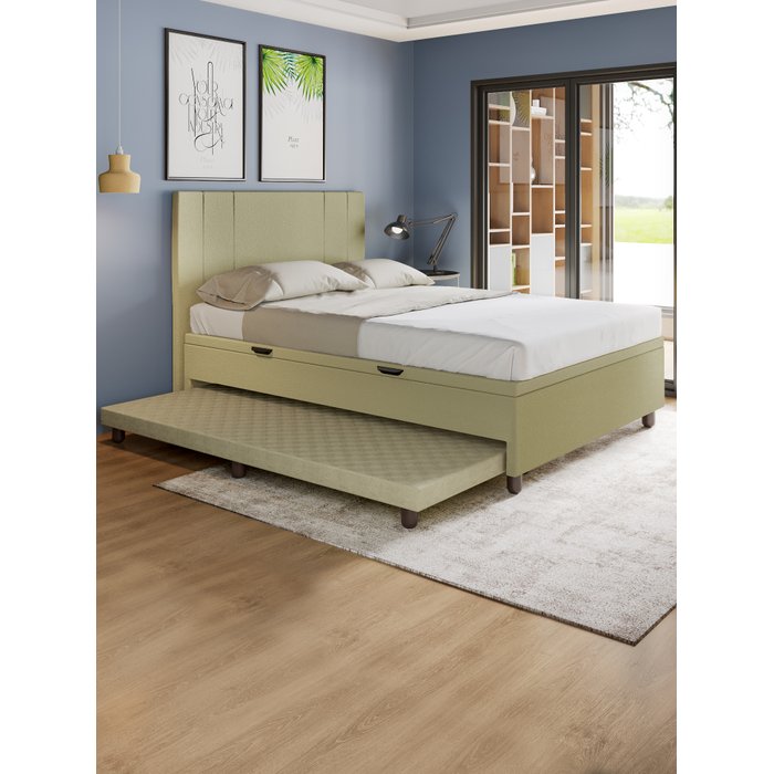 Base Cama Baú Casal com Cama Auxiliar C/colchão Conjugado Corino Bege - Skybox