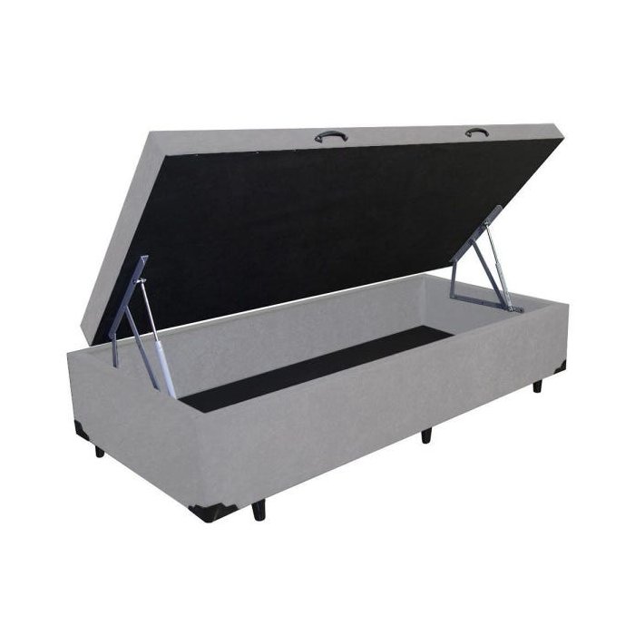 Feita com madeira reforçada 100% de reflorestamento, acabamento em tecido Suede, pistões à gás para uma abertura muito fácil, tratamento antialérgico e antiácaro, pés em madeira, estrutura recomendada para até 100kg distribuidos no box, laterais fechadas.