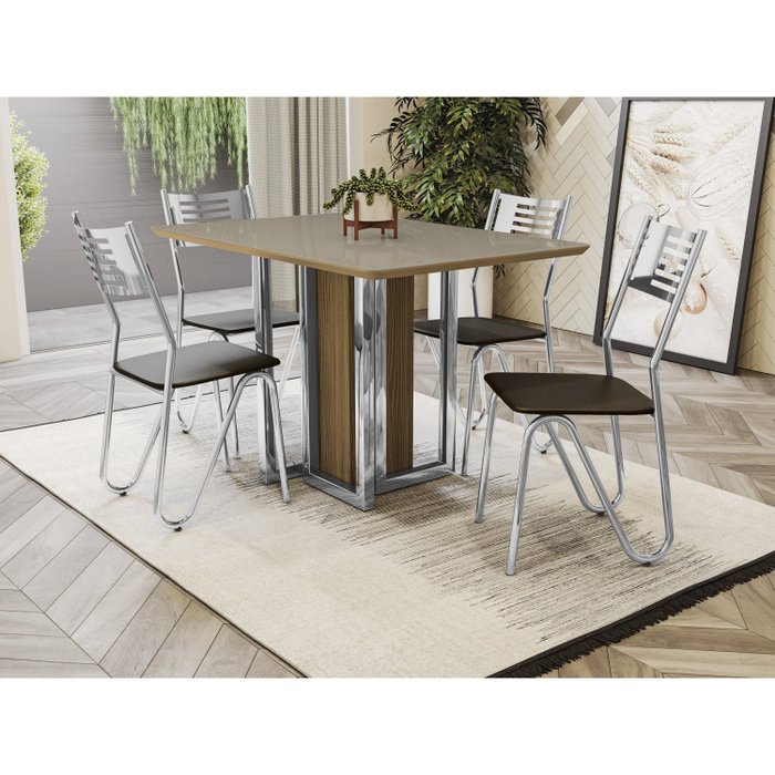 Prática sem perder a elegência, a Mesa Constance da linha Crome da Kappesberg deixará sua sala de jantar ainda mais completa. Com estrutura compacta e medidas de 75cm de altura, ela conta com uma base quadrada, podendo ser ajustada para opções de quatro ou seis lugares, conforme sua necessidade e tamanho do tampo. Unindo o metálico com o amadeirado, a base possui pintura touch na cor nogueira, garantindo estabilidade e estilo, enquanto que, a estrutura metálica na cor cromada, com acabamento brilho, garante o diferencial da peça. Escolha as cadeiras de sua preferência e monte o conjunto perfeito.