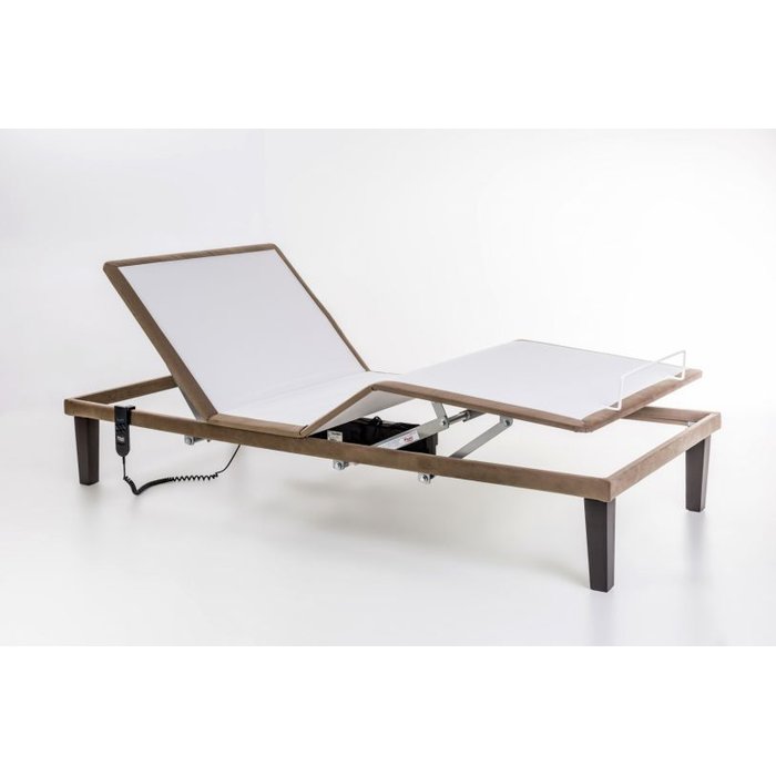 Cama motorizada com quadro revestido e estrado composto de chapa de MDF revestida.