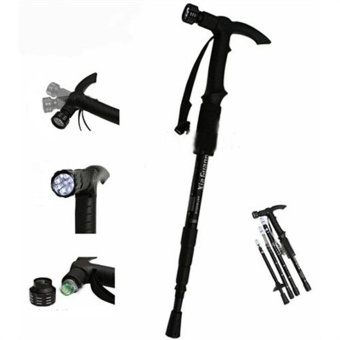 Bastão para caminhada com lanterna Led é leve e resistente, já que é fabricado em duraluminio.