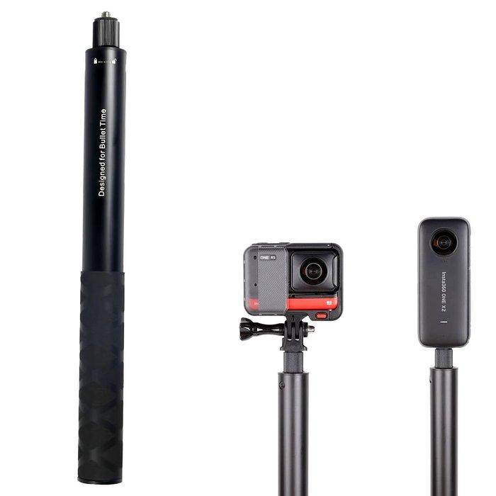 Apresentamos um bastão especialmente projetado para câmeras 360°, combinando estilo e robustez para oferecer uma camada adicional de proteção ao seu equipamento. Na extremidade superior, há uma conexão com um parafuso de 1/4, ampliando consideravelmente sua versatilidade ao possibilitar o uso com várias câmeras de ação, incluindo modelos como Insta 360 (One X, One X2, One R, GO 2), GoPro (todos os modelos), SJCam e outras Action Cams. É importante notar que, para câmeras como GoPro, é NECESSÁRIO utilizar um adaptador com encaixe de parafuso 1/4 (adaptador não incluso).