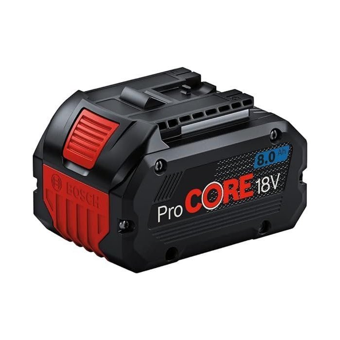 A Bateria de Íons de Lítio Bosch ProCORE 18V 8,0Ah, é a Melhor Bateria do Planeta! Oferece máxima performance e é super leve e compacta. Possui terminais de cobre e solda a laser para máxima transferência de energia para a ferramenta e células internas maiores garantem maior potência. Além disso, a carcaça da bateria possui tecnologia Coolpack de última geração que direciona o calor para fora da bateria aumentando sua vida útil. A Bateria ProCORE é 100% compatível com todas as Ferramentas e Carregadores 18V Bosch.