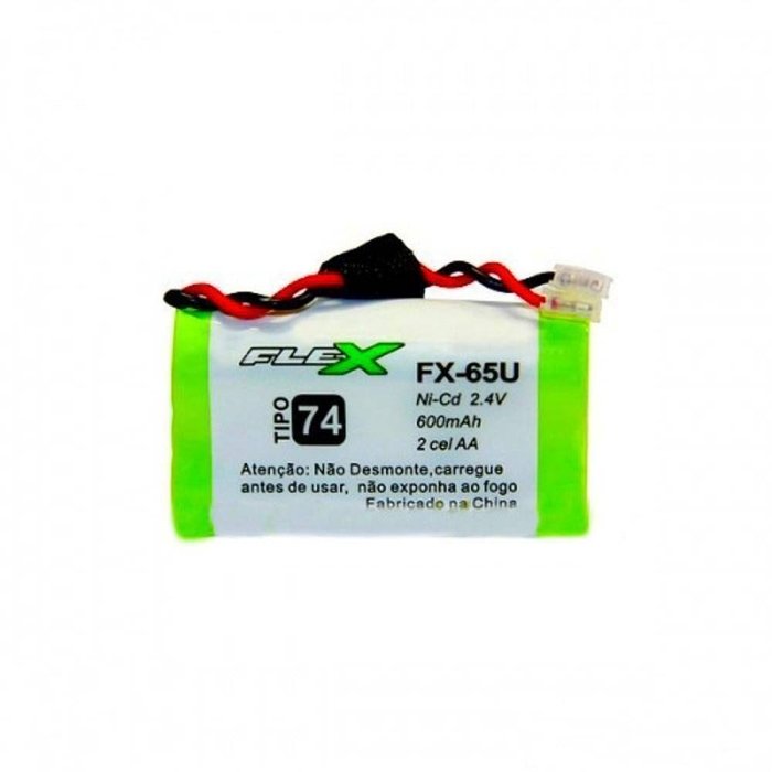 DESCRIÇÃOBateria Telefone Fx-65U-Código: Fx-65U - Produto: Bateria Para Telefone Sem Fio - Tipo: Embalagem Individual Com 1 Unidade - Marca: Flex - Voltagem Nominal: 2,4 Volts - Capacidade Nominal: 600mAh - 2 Células ? 4/5 Aa - Plug Universal - Recarregável De Ni-Cd (Níquel-Cádmio)- Compatibilidades: - Panasonic - Toshiba - Ge E Outras Marcas. Obs: 1- Antes Do Uso Tenha Certeza De Que A Bateria Tenha O Mesmo Formato, Voltagem,Tamanho E O Mesmo Plug Da Bateria Que Será Substituída 2- O Fio Vermelho Da Bateria É Positivo. O Fio Preto É Negativo 3- O Tempo Da Primeira Carga Deverá Ser De 12 Horas.