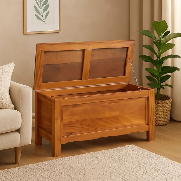 Banco baú em madeira maciça com 1 metro, cor natural e acabamento envernizado. Assento confortável e funcional, ideal para organizar brinquedos e objetos com praticidade e estilo em qualquer ambiente.