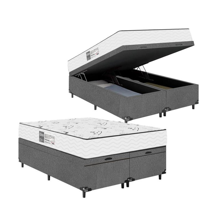 Baú Casal Bipartido Suede Cinza + Colchão D33 One Face Branco- E-shop Casa Cinza