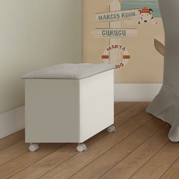 Com amplo espaço interno o Baú Elô possui estrutura 100% MDF, acabamento em pintura UV, tampo com estofamento capitonê em tecido corino ou suede, 04 rodízios (sendo 02 com travas) e abertura feita por pistão a gás e dobradiças metálicas. Perfeito para compor o quartinho do seu bebê.