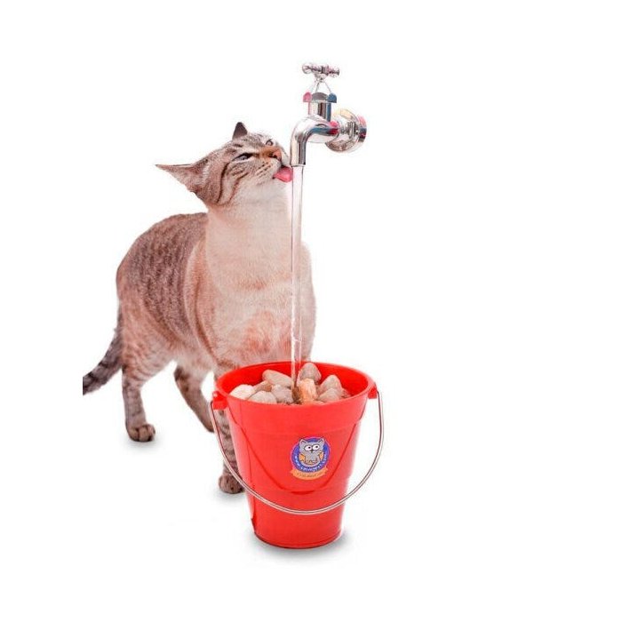Como funciona: em um extremo o cano fica ligado a um motor no fundo do balde que impulsiona a água por dentro dele (do balde até a torneira). No outro, fica conectado à torneira, onde o fluxo de água passa ao redor do cano. Assim, a água cai formando um pequeno espelho de água, por onde o gatinho pode se refrescar. Para o bebedouro funcionar você precisa, apenas, de uma tomada (110v ou 220v) e por isso não precisa instalar na parede.
