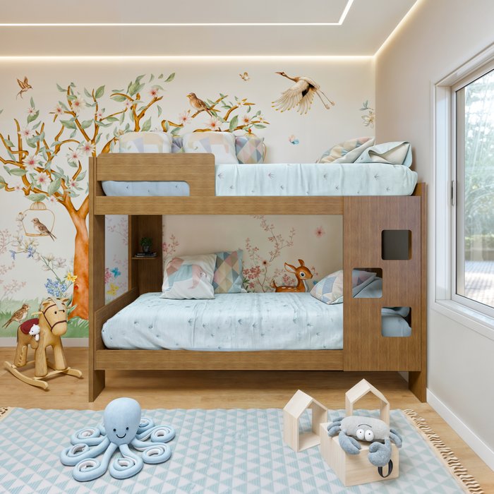 | Informações Complementares (Novo) | Beliche equipada com cantoneira para celular, proteção lateral na cama superior. Sua escada é projetada na frente para facilitar o acesso à cama superior quando montada em ambiente apertado, pés e barras em MDF de 25mm dando total resistência e segurança |