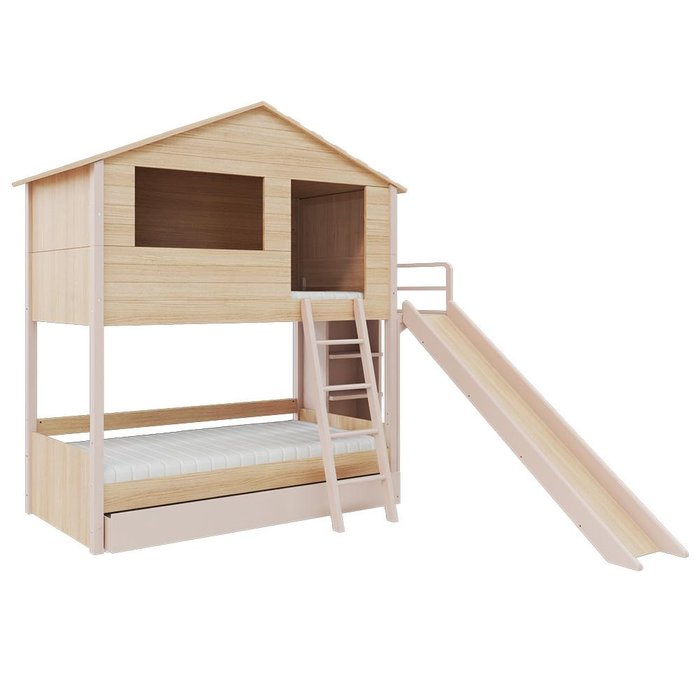 Beliche Açaí com Casinha, Escorregador e Cama Auxiliar Carvalho e Rosa Old - Cia do Móvel Rosa Old