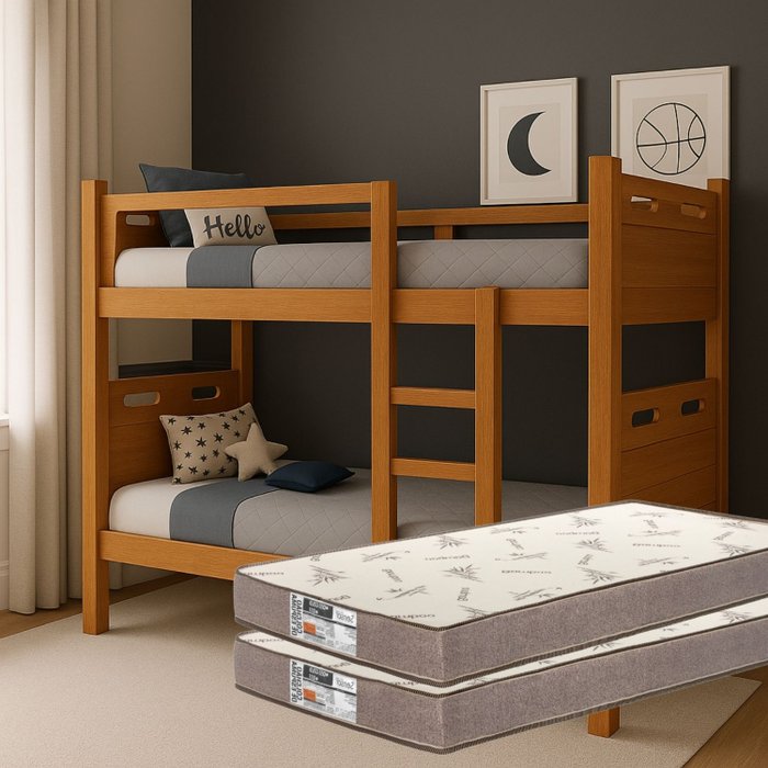 --Itens inclusos: 01 (uma) beliche, 02 (dois) colchões densidade D33, manual de montagem, parafusos e peças para acabamento.