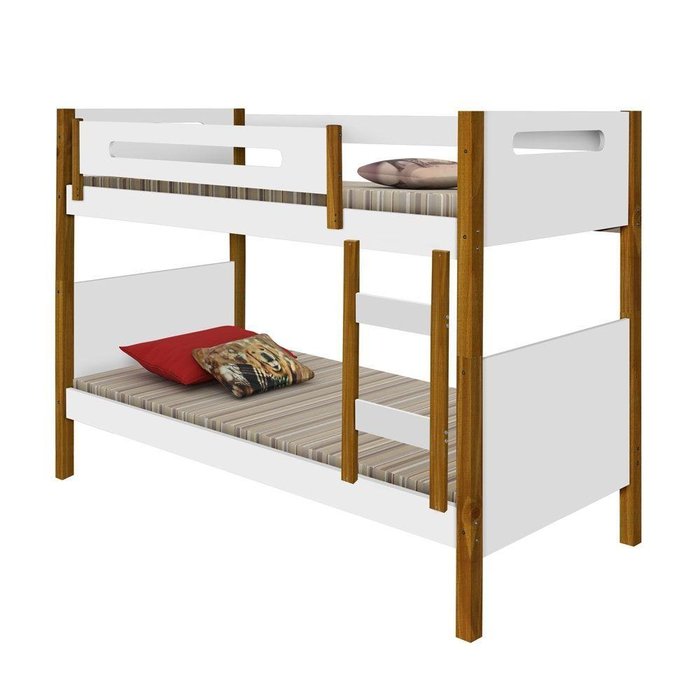 Cama superior com duas grades de proteção, sendo uma interiça em um dos lados, proporcionando mais segurança. O pés são em madeira maciça.