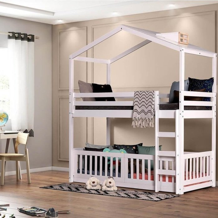 A estrutura montessoriana estimula a independência da criança, deixando-a descobrir por si só os primeiros passos e obstáculos, de forma segura, onde ela sozinha irá subir e descer da cama. A cama da parte inferior conta com a grade RN, toda cercada, ideal para bebês.