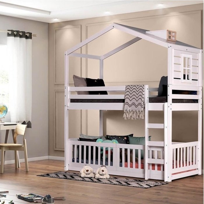 A estrutura montessoriana estimula a independência da criança, deixando-a descobrir por si só os primeiros passos e obstáculos, de forma segura, onde ela sozinha irá subir e descer da cama. A cama da parte inferior conta com a grade RN, toda cercada, ideal para bebês.