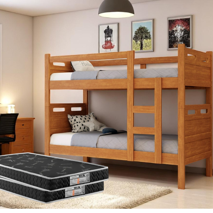 Destaques do Produto:- 2 Colchões D20/12 cm – Espuma premium de alta densidade para conforto e durabilidade.- Estrutura Reforçada – Suporta até 100 kg por leito, seguro para adultos e crianças.- Transformável em 2 Camas – Flexível para diferentes ambientes e necessidades.- Madeira de Qualidade – Ripas e travessas resistentes para máxima estabilidade.- Pés Anti-umidade – Proteção contra umidade e maior vida útil.