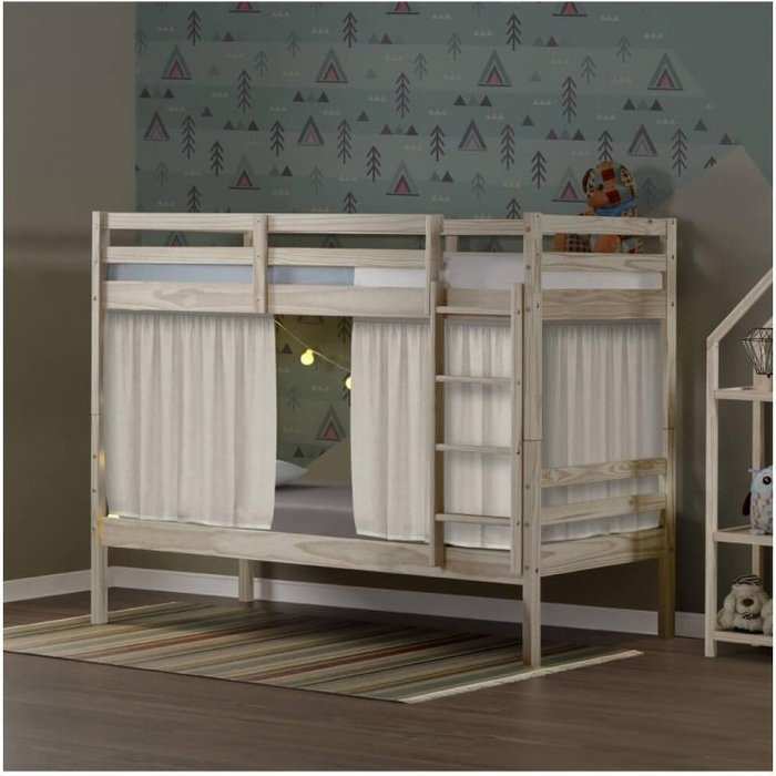 A cama superior conta com grade em todo seu redor e na parte frontal, uma escada de fácil acesso com 4 degraus. A escada pode ser montada do lado direito ou esquerdo, essa escolha deve ser feita conforme o posicionamento da cama no quarto, para facilitar as brincadeiras e o vai e vem diário no ambiente. A cama da parte debaixo, conta com grade nas laterais e uma linda tenda creme microfibra 100% poliéster.