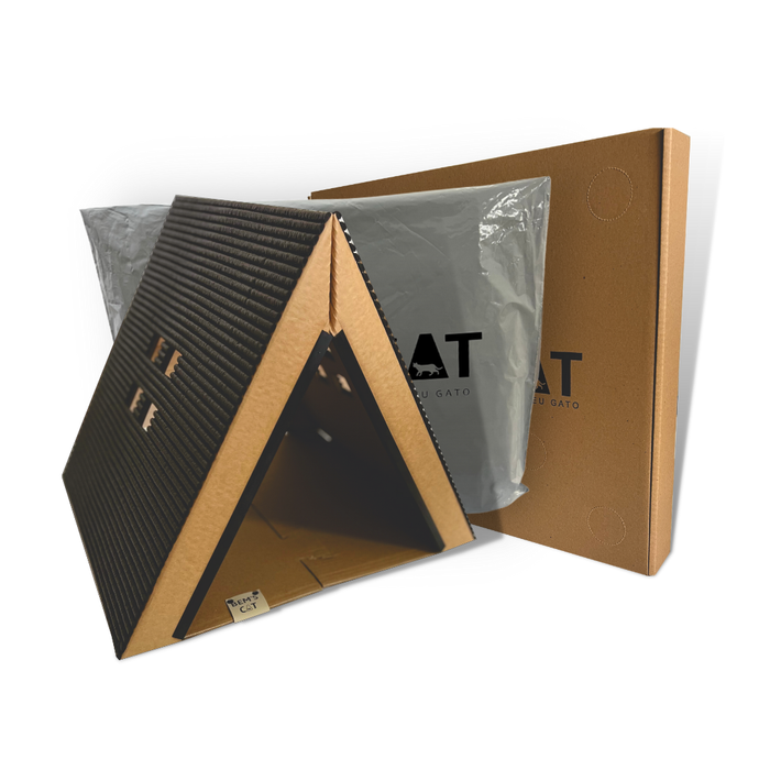 Ambos possuem o papelão como material de base de sua estrutura, material queridinho dos felinos, que além de segurança, proporciona acolhimento e bem-estar através da temperatura agradável. Possui design moderno, janelas nas laterais, protetores de bordas, assim como telhado emborrachado, se encaixando em qualquer cômodo da casa. Por possuir onda dupla, possui estrutura resistente mas exige cuidados com umidade e também com dobras desnecessárias, aumentando assim sua vida útil.