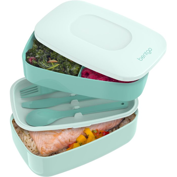 Bentgo® Clássica – Caixa Bento para Adultos, Lancheira Empilhável Multifuncional com 3 Compartimentos, Utensílios de Plástico e Alça de Vedação de Nylon, Recipiente para Alimentos Livre de BPA (Aqua)