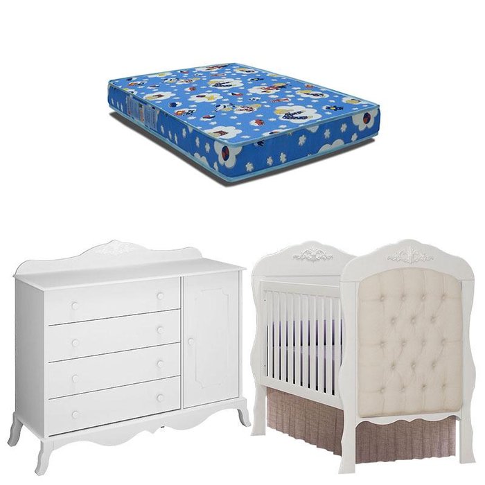 Berço Americano Capitone com Colchão e Cômoda Infantil Realeza Branco Acetinado – Canaã Branco Acetinado