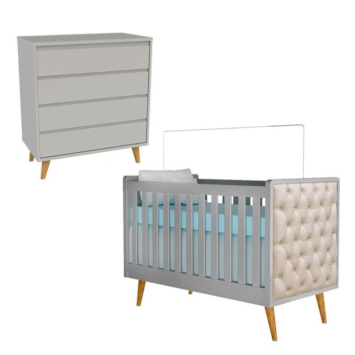 Berço Americano com Capitonê e Cômoda Lorena Cinza Amadeirado - Carolina