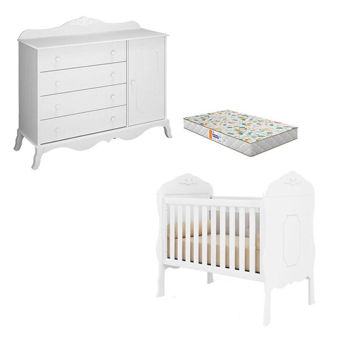 Berço Americano e Cômoda 1 Porta Realeza Branco Acetinado com Colchão Gazin – Canaã Branco Acetinado