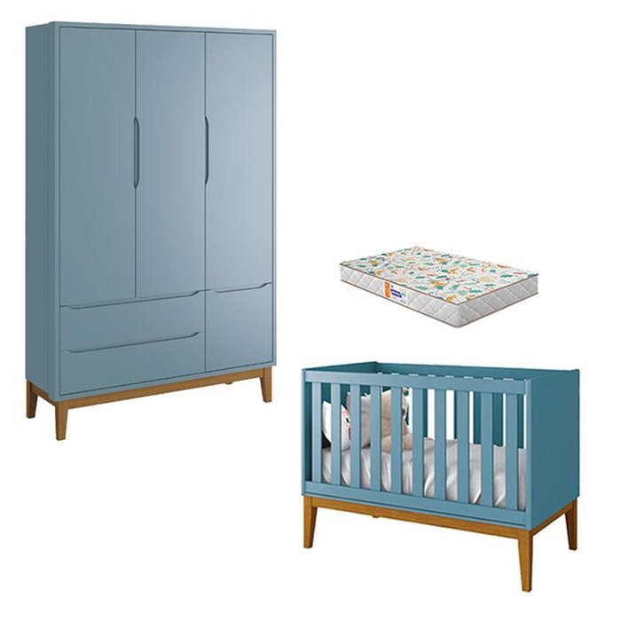 Berço Americano e Guarda Roupa 3 Portas New Classic Azul com Pés Madeira e Colchão Gazin – Reller