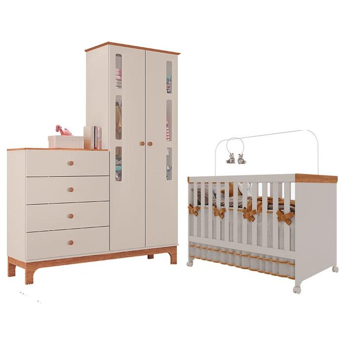 Berço Americano e Guarda Roupa com Cômoda Antonella Off White Caramelo - Canaã