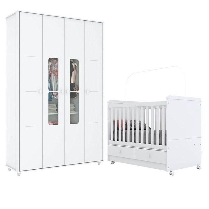 Berço Americano e Guarda Roupa Infantil Aquarela Branco - Henn