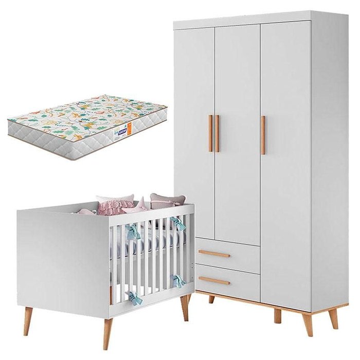 Berço Americano e Guarda Roupa Infantil Ludmila Branco Bétula com Colchão Gazin – Carolina