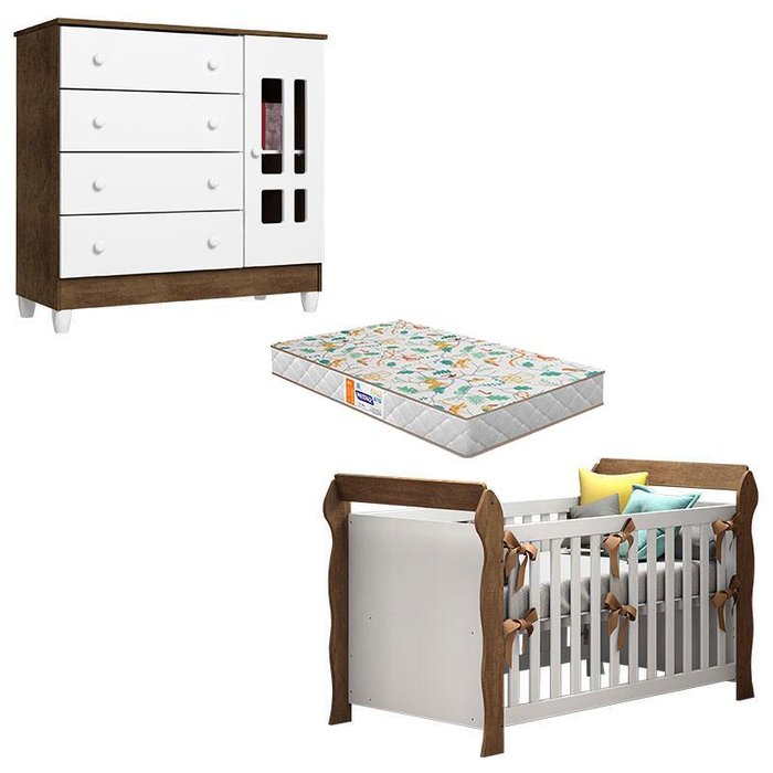 Berço Americano Lara e Cômoda Ariel Branco Acetinado Amadeirado com Colchão Gazin – Carolina