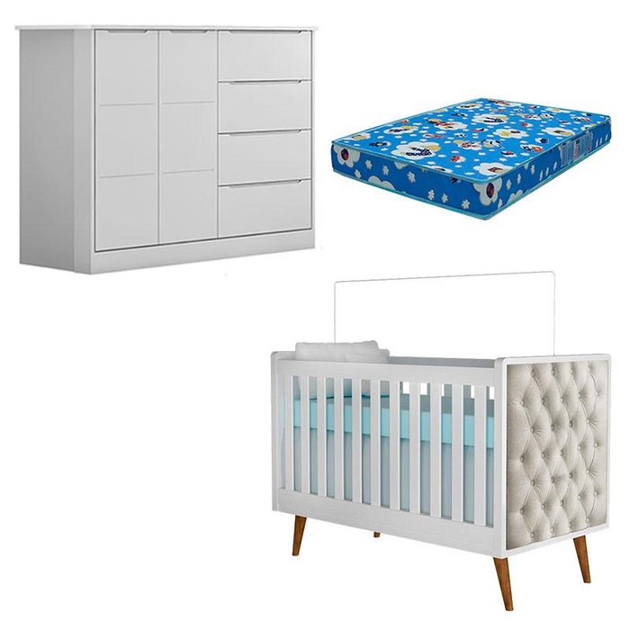 Berço Americano Lorena com Capitonê Bege Cômoda Infantil Eloá Branco Acetinado com Colchão Ortobom – Phoenix Baby