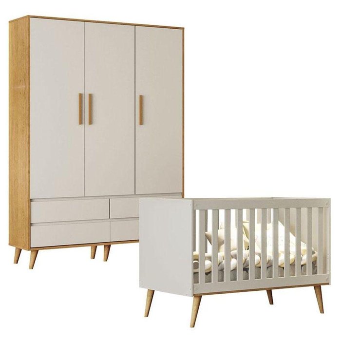 Berço Americano Ludmila e Guarda Roupa Infantil Lorena 3 Portas Off White Bétula - Carolina Baby
