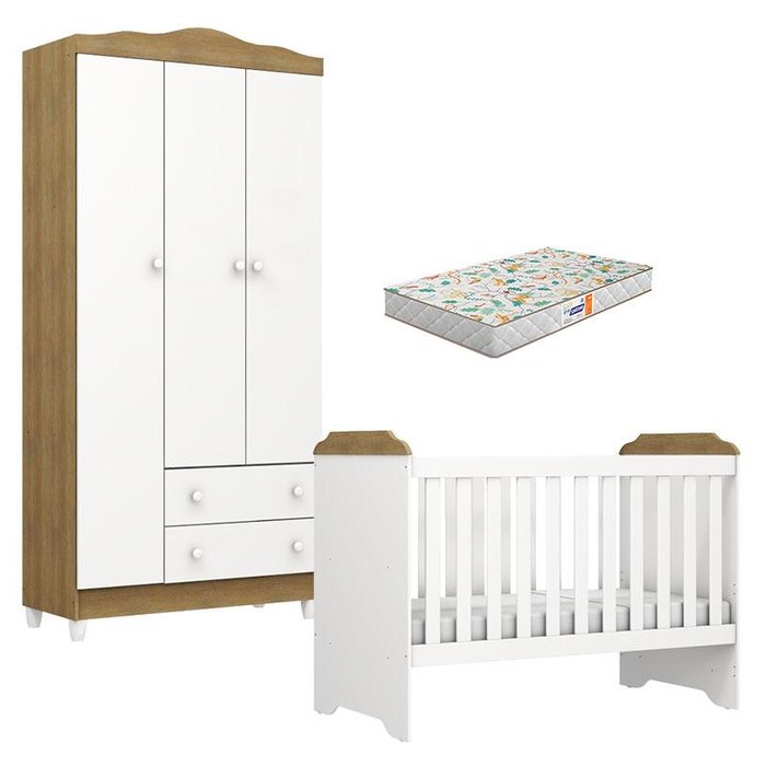 Berço Americano Mini Cama e Guarda Roupa Mel Flat Branco Acetinado Amadeirado com Colchão Gazin - Ca