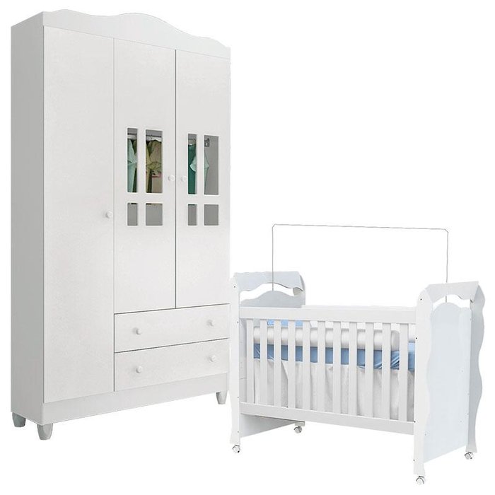 Berço Americano New Nanda e Guarda Roupa Infantil Ariel 3 Portas Branco Brilho – Carolina