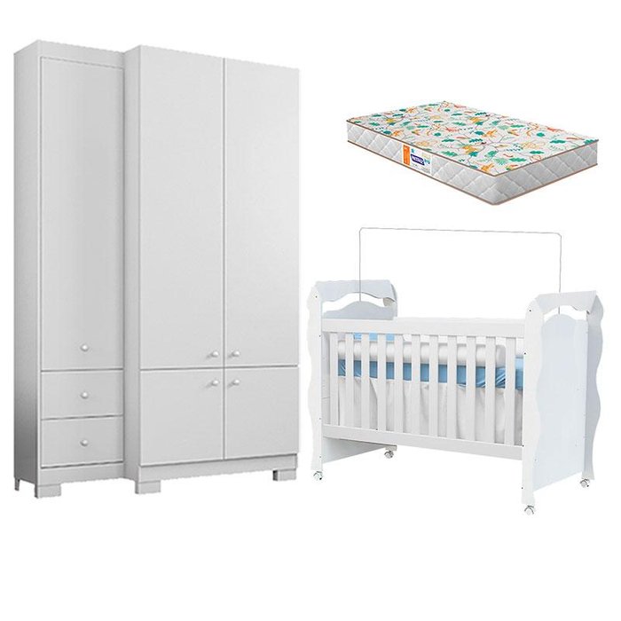 Berço Americano New Nanda e Guarda Roupa Infantil B22052 Branco Brilho com Colchão da Gazin - Araplac