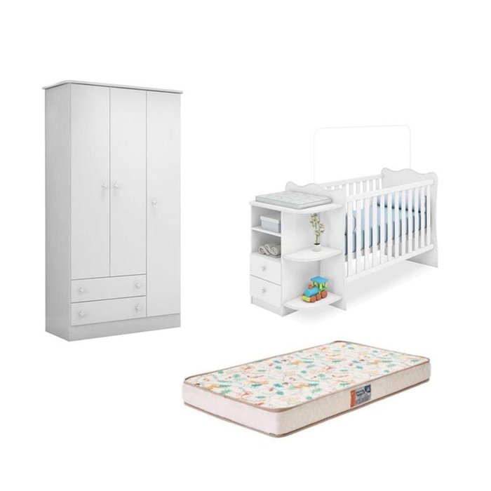 Berço Com Cômoda Doce Sonho Com Colchão Gazin E Guarda Roupa Doce Sonho Branco - Fdecor