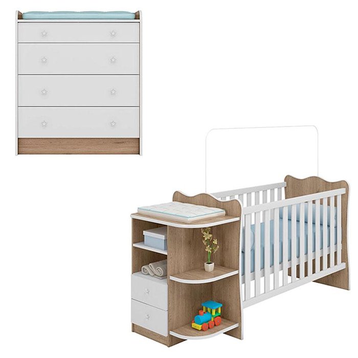 Na hora de escolher os móveis para o quartinho do bebê conte com a gente! Apresentamos uma linda opção de combo para você que procura conforto, segurança, qualidade e praticidade, Berço Cômoda com Cantoneira 101 e Cômoda Trocador 2523 da linha Doce Sonho na cor Carvalho Rústico TOQ Branco desenvolvidos pela Qmovi possui um amplo espaço interno para melhor organização das roupinhas. Confira e aproveite!