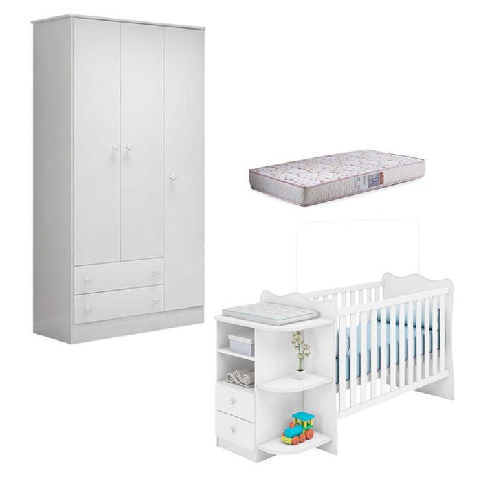 Berço Cômoda com Cantoneira 101 e Guarda Roupa 2617 Doce Sonho Branco Brilho com Colchão Gazin – Qmovi