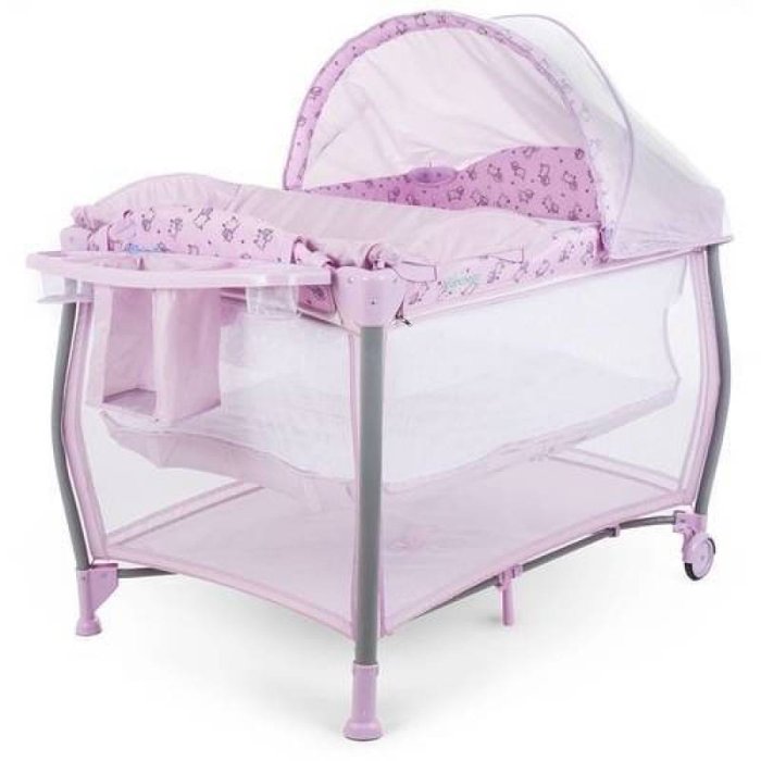 Berço desmontável Aconchego da Burigotto, possui capota, trocador e porta objetos, além de mosquiteiro. Rodas com freios, amplo cesto frontal e outro na lateral. Sistema de regulagem de altura da base acolchoada e acompanha bolsa para guardar e transportar.