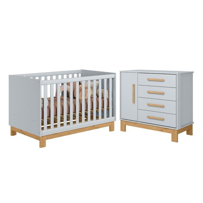 Berço E Cômoda Com 4 Gavetas Nauru Cinza Acetinado