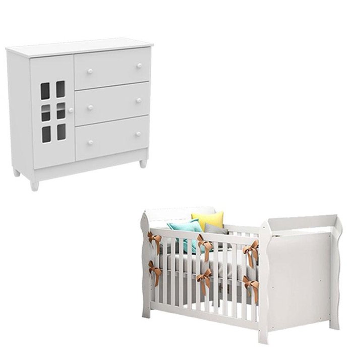 Berço Lara e Cômoda Infantil Mariah Branco Brilho - Carolina