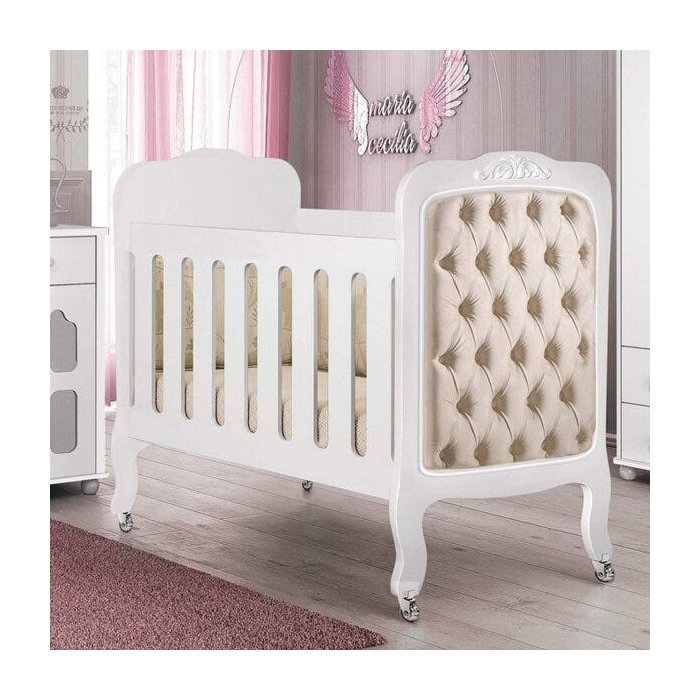 Berço Imperial Branco com Captone Bege, realçando o estilo Provençal com estrutura em MDF, rodízio em Gel com chapas de 26 mm, regulagens de estrado, painéis de 25 mm, Capitonê em tecido sued ( anti-inflamatório ), estrados em MDF, Berço que transforma - se em sofá cama, com arabescos e Grades usinadas com Chapas de 18 mm.