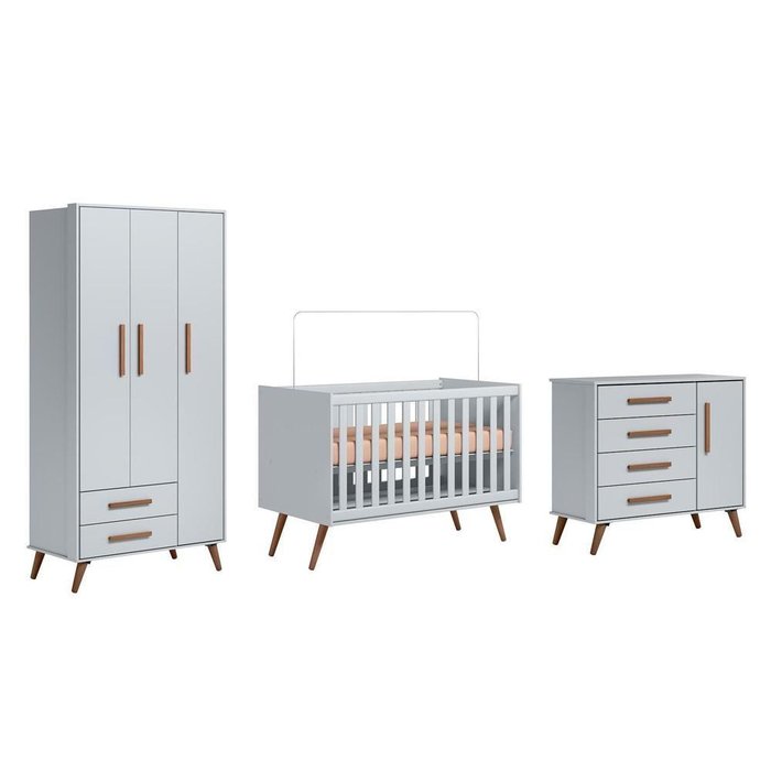 Berço Mini Cama + Guarda Roupa Infantil 3 Portas + Comoda Sapateira Retro - Cinza