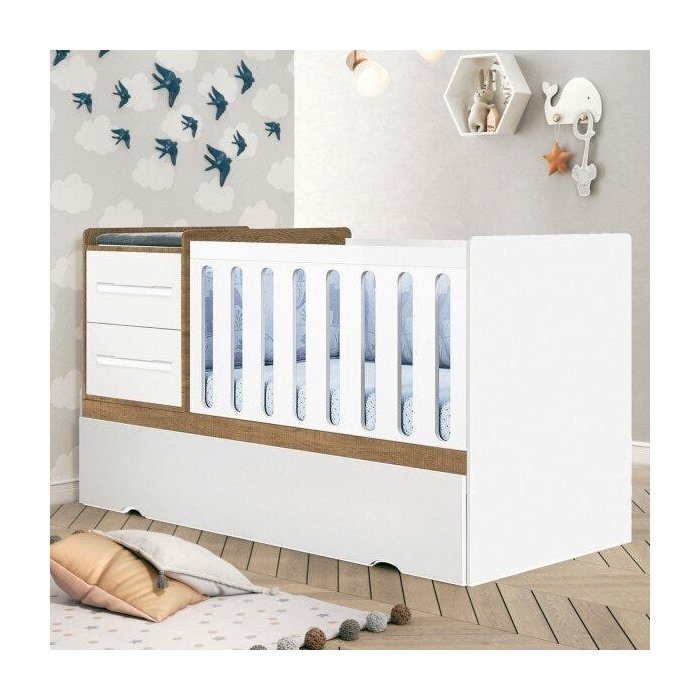 Berço Mini Cama Multifuncional 5 em 1 Premium Planet Baby Amêndoa/Branco